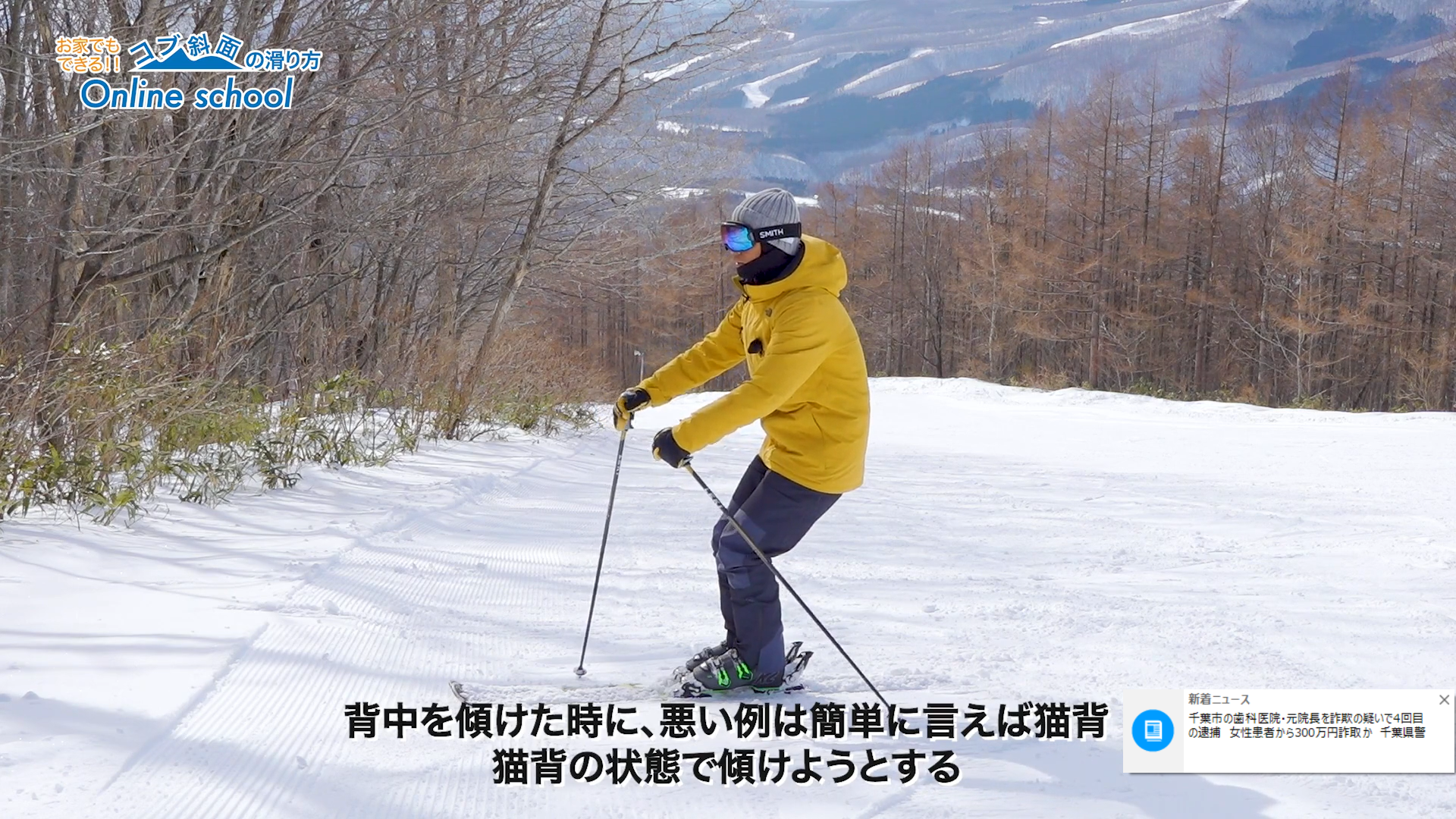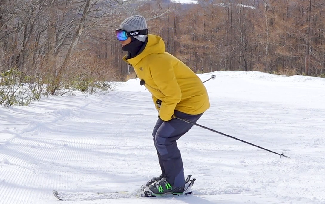 背中を傾けるだけでなく、お尻の位置を引いていく、股関節を引いていく、おヘソを雪面に向けていく、お尻の穴を空に向ける様な感じなどもあります。