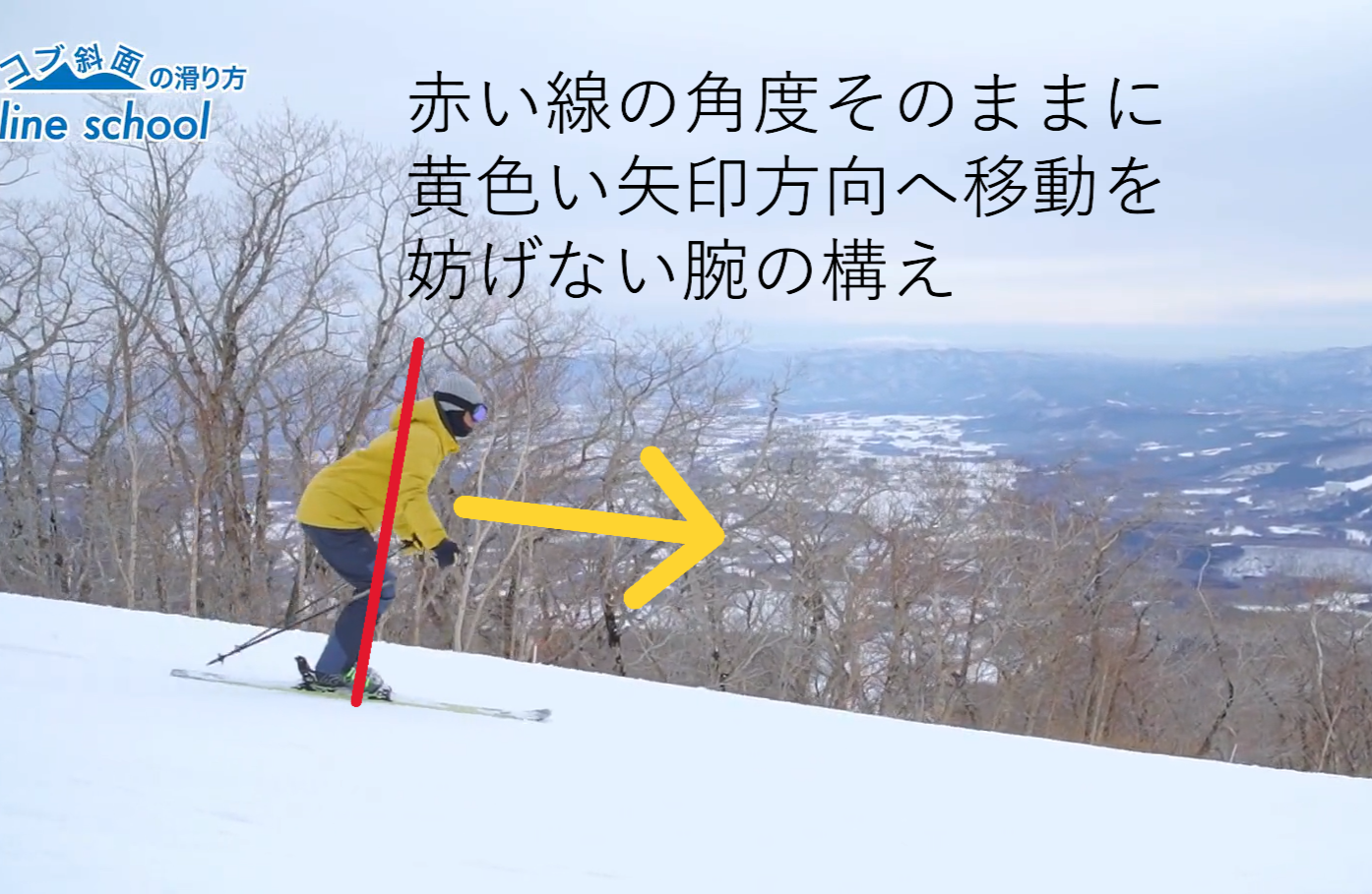 赤い線を傾けずに、黄色の矢印方向に進めるイメージでかまいません。青の矢印方向は斜面に水平ですが逆エッジで転倒するケースがあります。