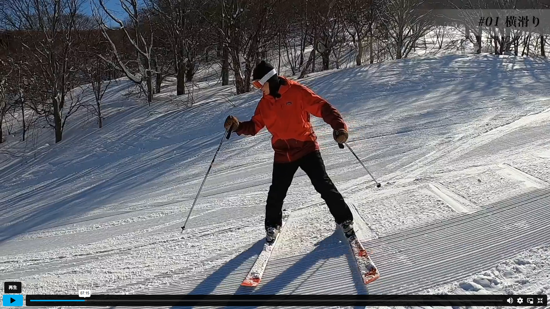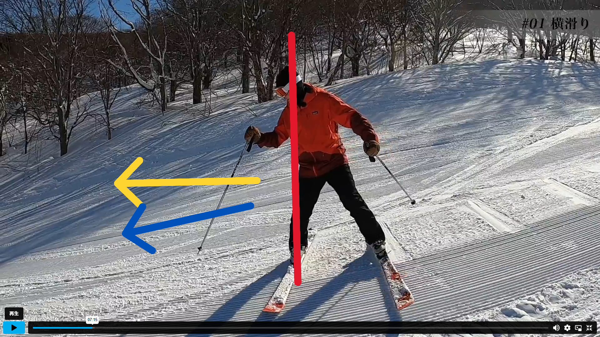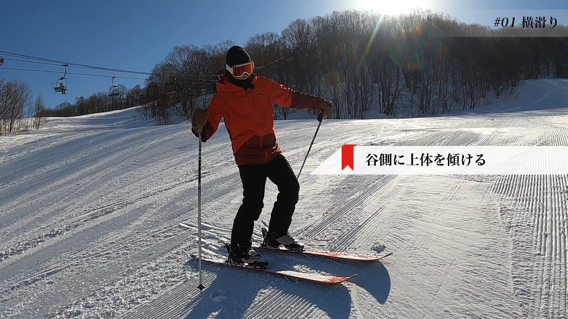 このとき大事な事は基本姿勢が崩れていないことですが、そもそも横向きから滑り出す時、既にスキーに置いていかれて、ポジションが戻せないケースが非常に多いです。必ず、基本姿勢を作ってからスタートをします。