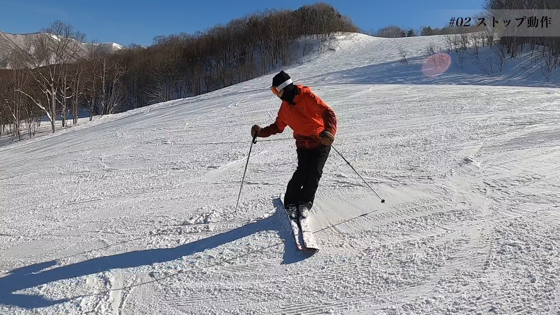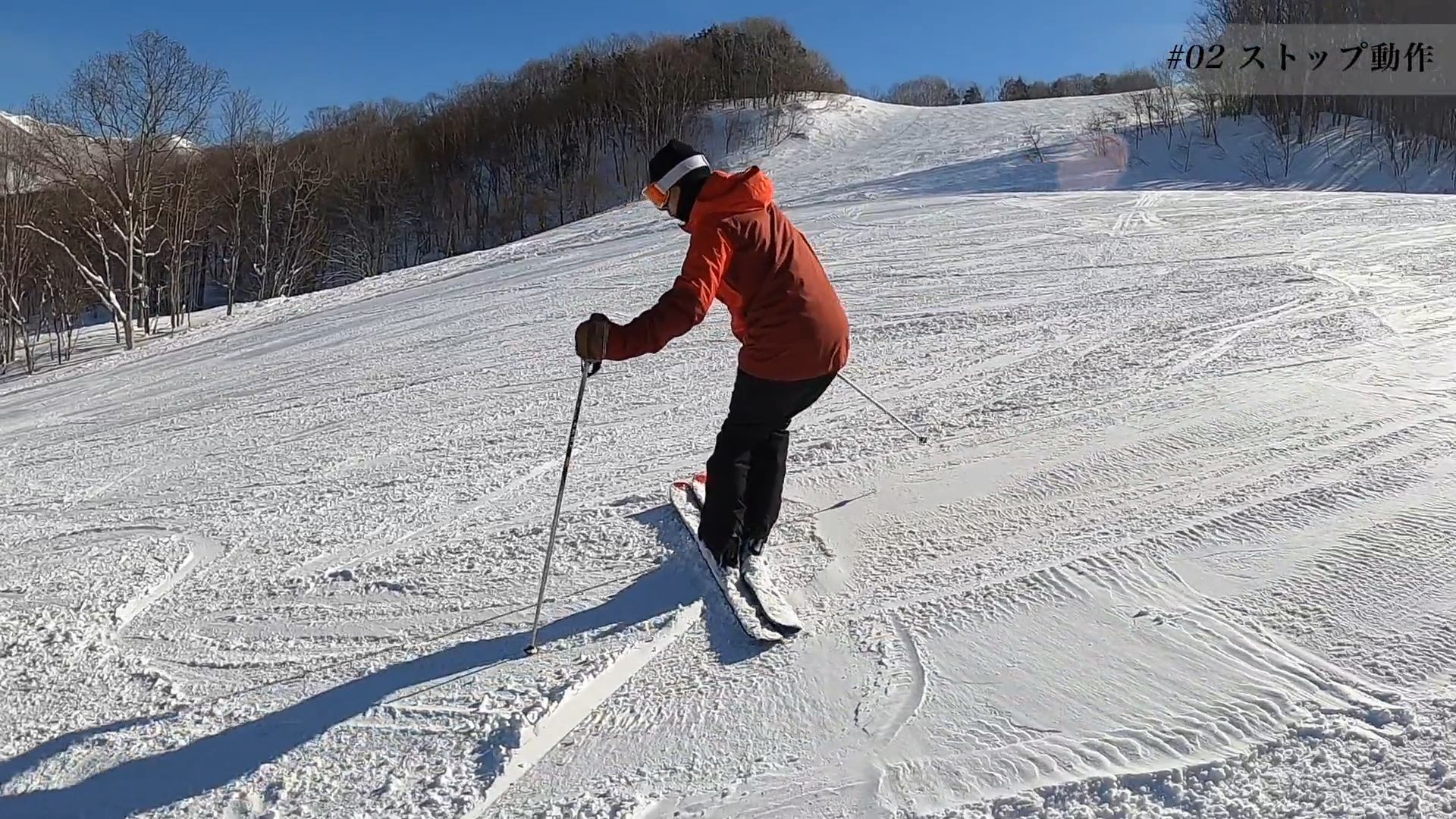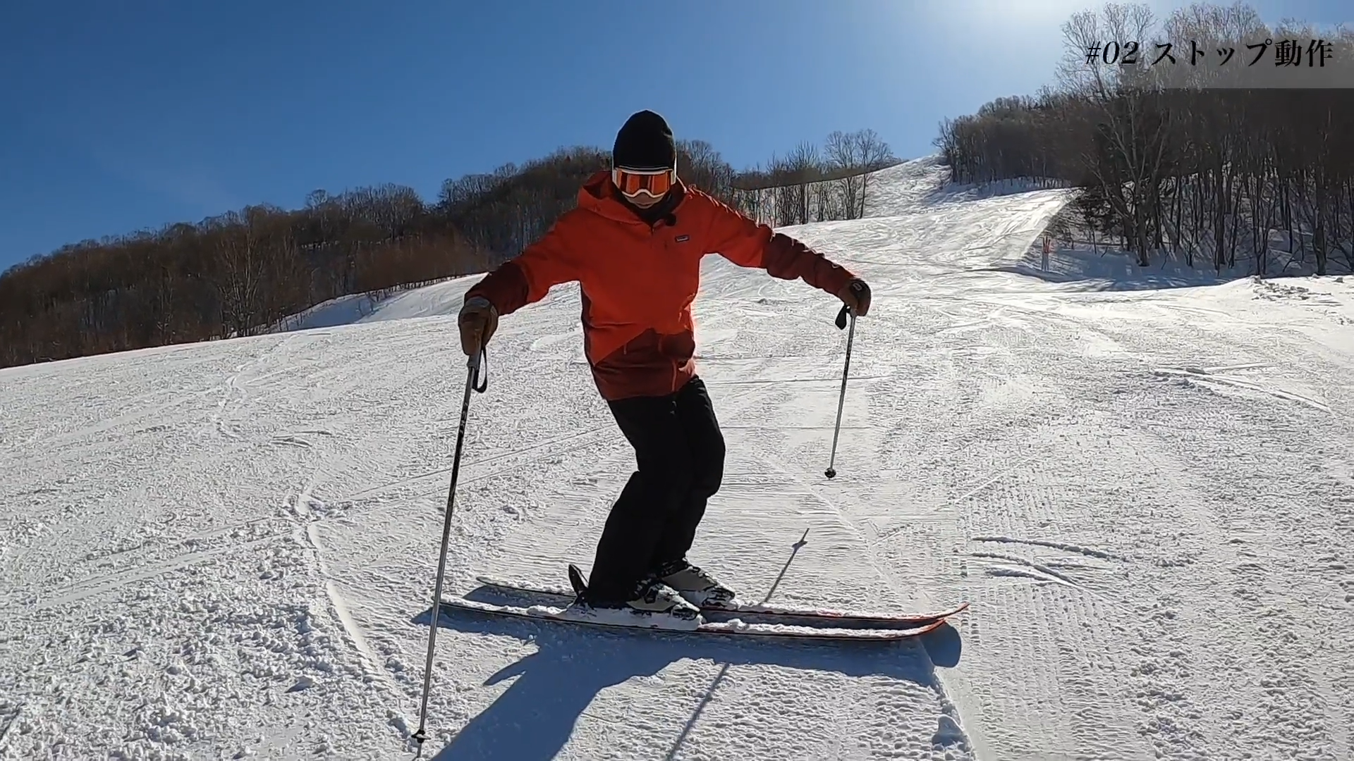 上の写真は完璧な停止姿勢ですので、前後差が無く、スタンスも閉脚になっています。これは既に動き出せる準備が整った状態ですので、この姿勢がスライド停止でも出来れば卒業です。