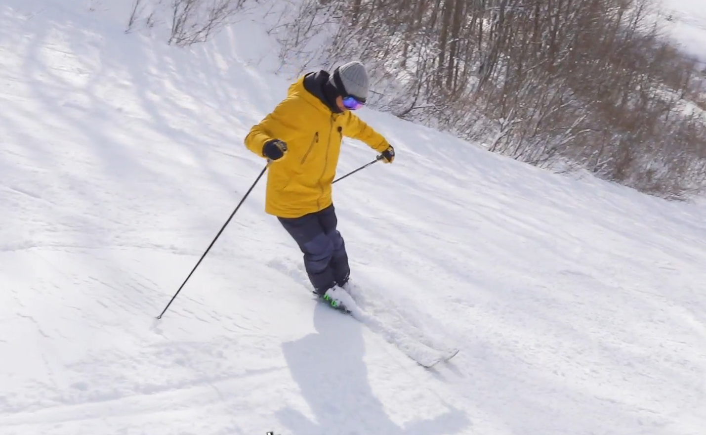 コブ力の受け止めを想定してピボット操作してからしゃがみますがスキーや、雪面に力で荷重する気は全くありません。高くなった自分の身体の重さを、足の力を一気に抜いて低くなった状態です。足を踏ん張って雪面を押している状態ではありません。