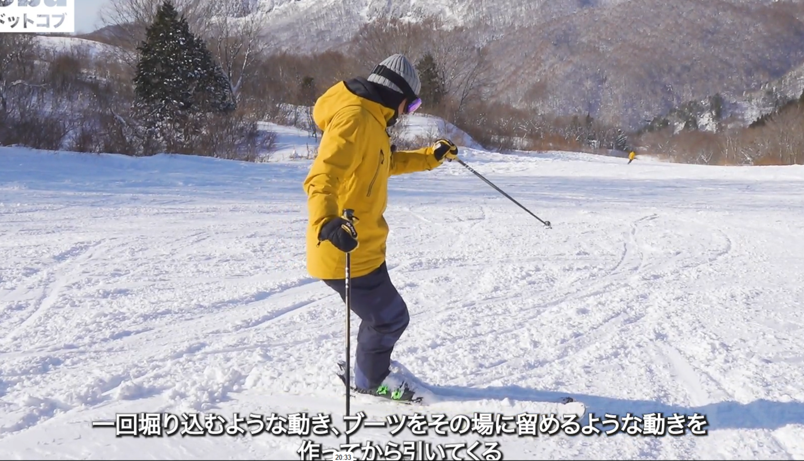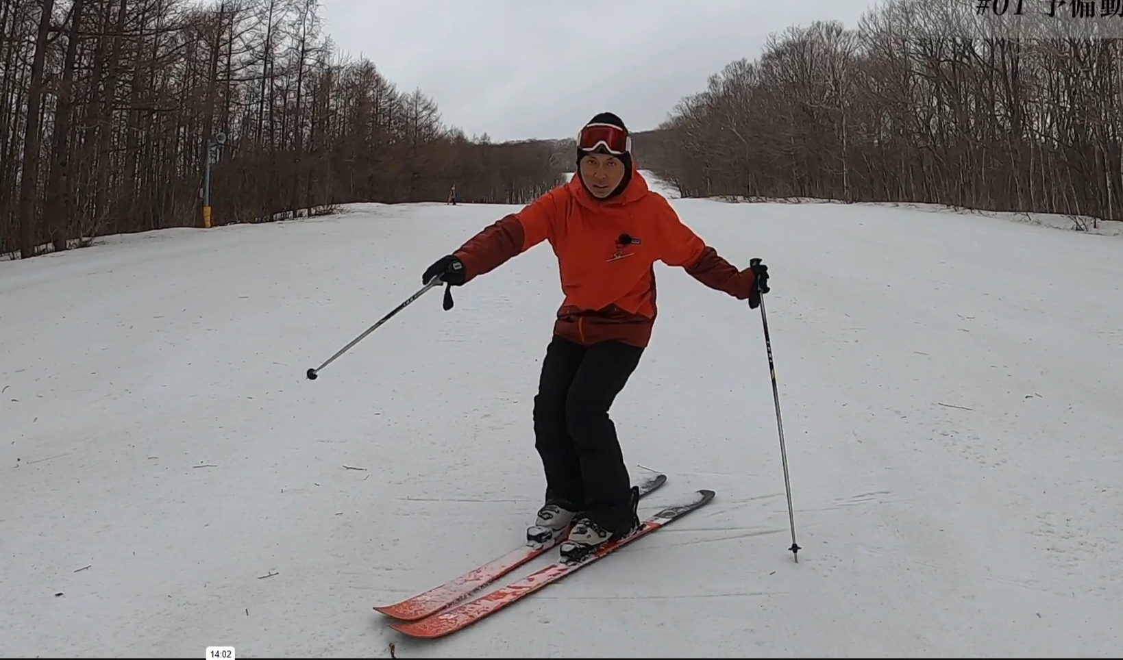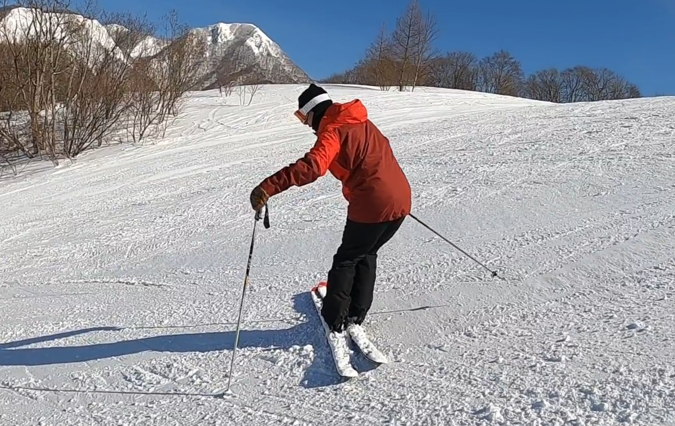 このドリルはスキー操作に加えて身体全体の動きが身につきます。トップからの始動、ブーツを引く、スキーの回旋、切替しの重心移動をワンパッケージで習得します。