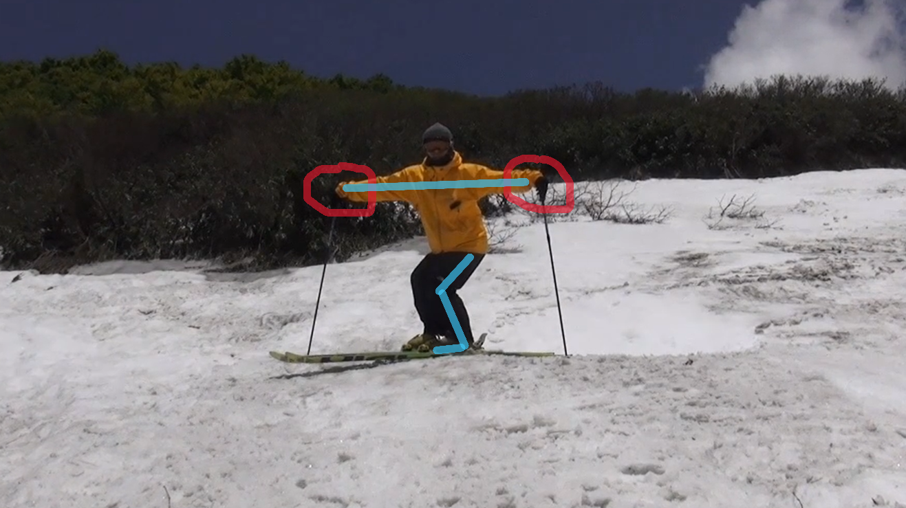 ■正しい姿勢。谷側への傾き、目線、スタンス幅(なし)、スキーの前後差(なし)、谷腕・山腕・ストックの位置