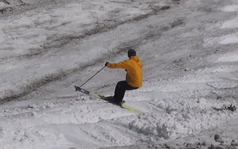 しゃがんだ状態からピボット操作で方向転換をします。この時の高い姿勢ですが、身体を長くしていくイメージが良いと思います。身体を伸ばす準備で収縮したものが膨張するイメージですね。スキーの方向転換の周期と、ターンの周期を一致させて、後半の横スライドがあまり出ないように、スキーの向きを変えきるまで抜重している動きを見せるようにしましょう。