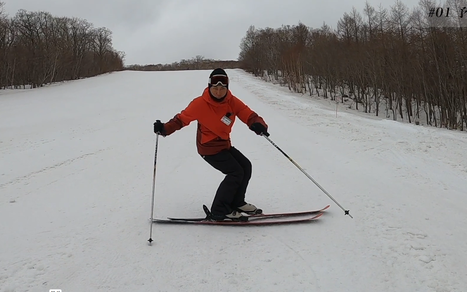 ■はじめてクラスではGOOD!ですが、傾きが弱い。目線、身体がスキーに正対。スタンス幅広い、前後差大きい、足のバラケ、回転系になる可能性。
