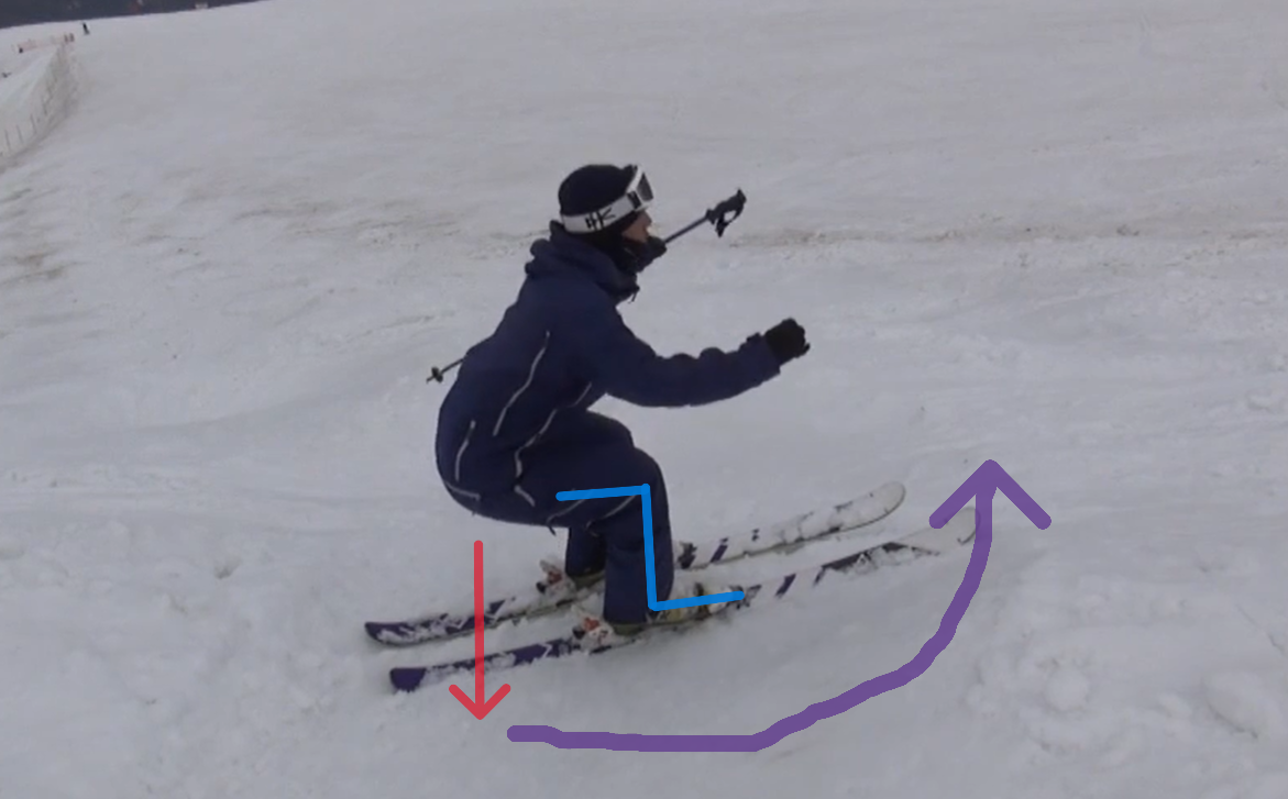 ・背中とスネの角度が平行になり、コブ裏の急斜面に垂直な状態になっています。