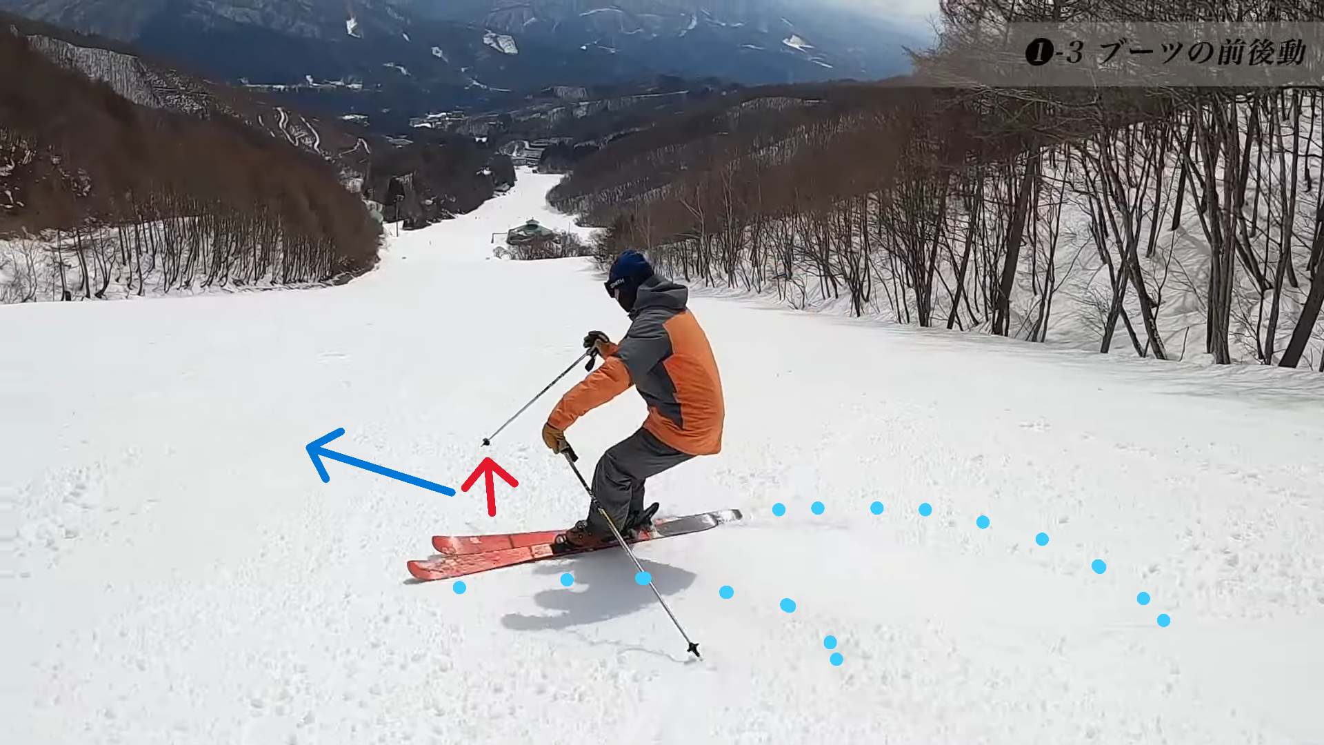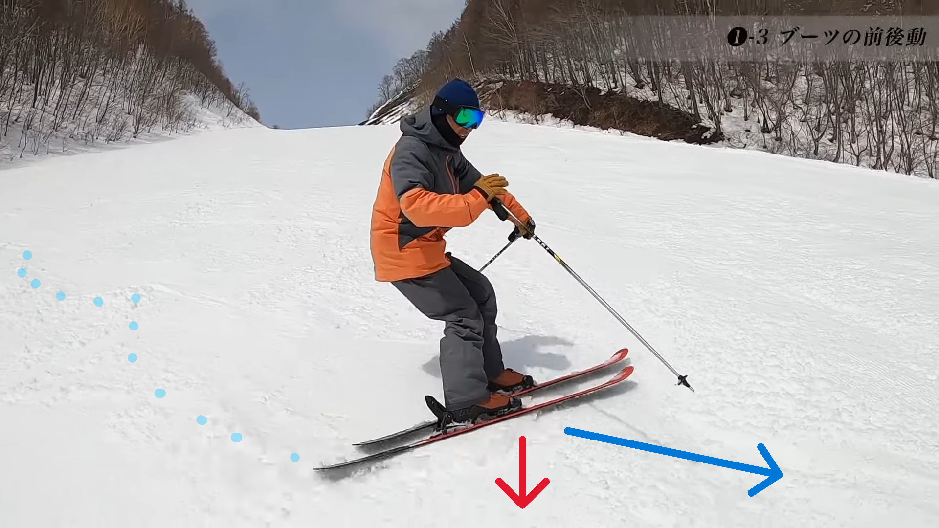 ・斜滑降方向進む上体、等速に対してブーツが斜め前後に動いている状態です。