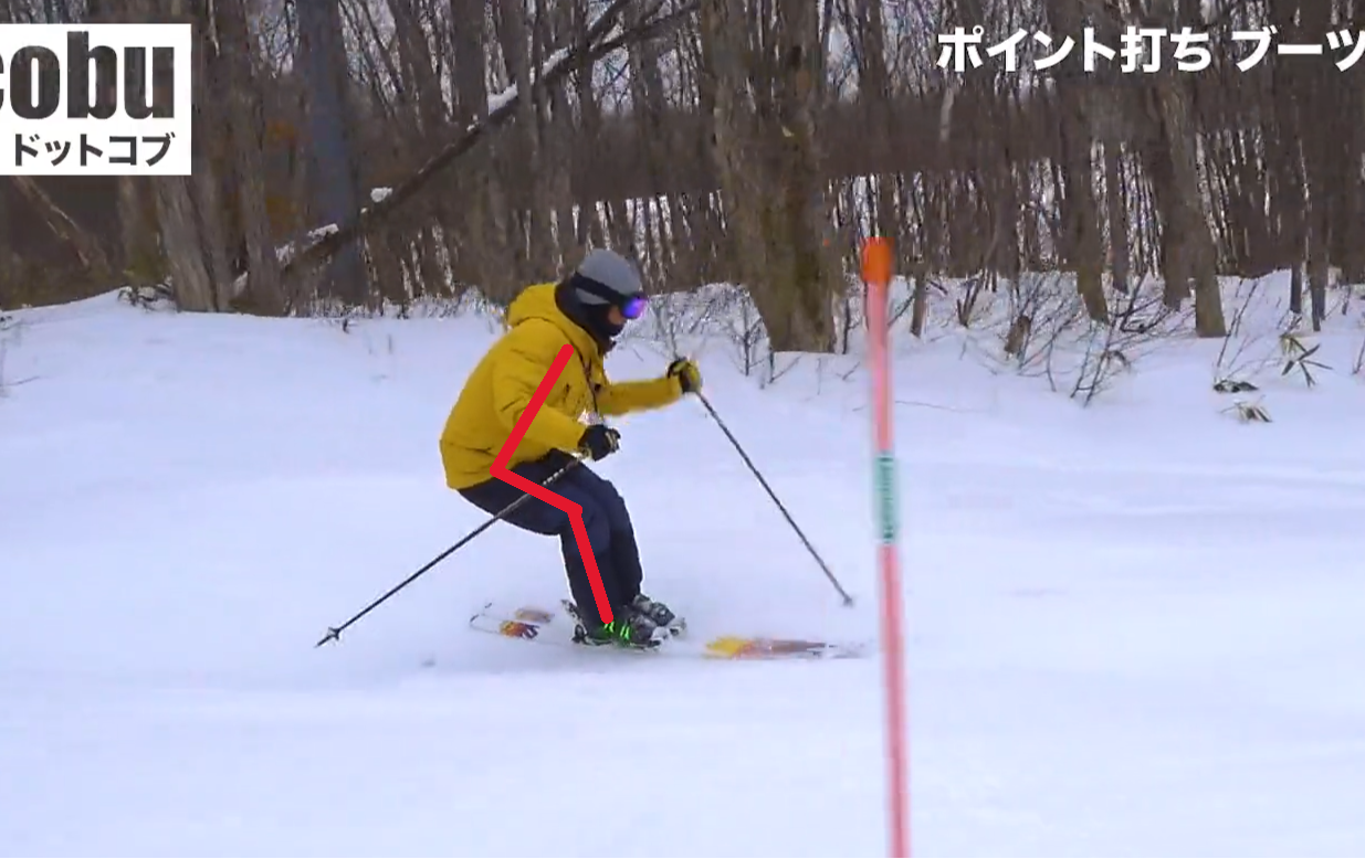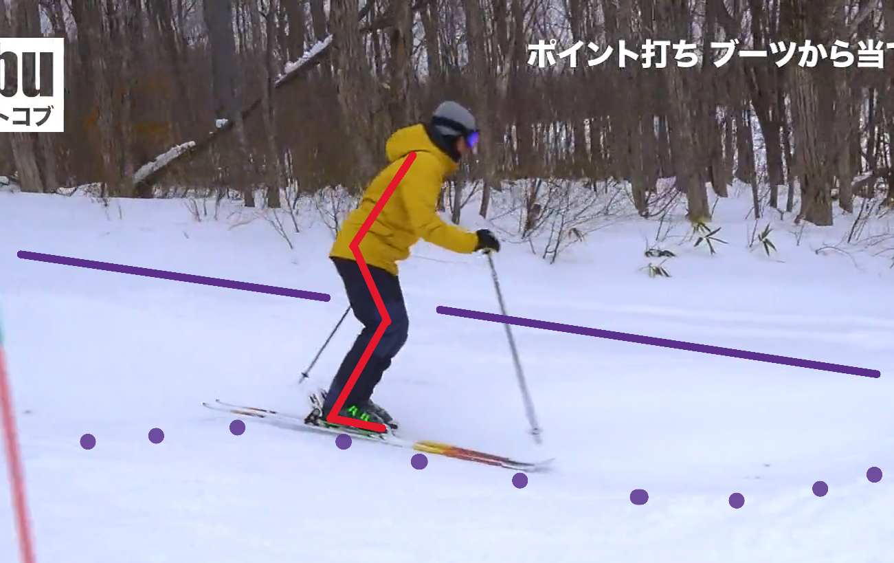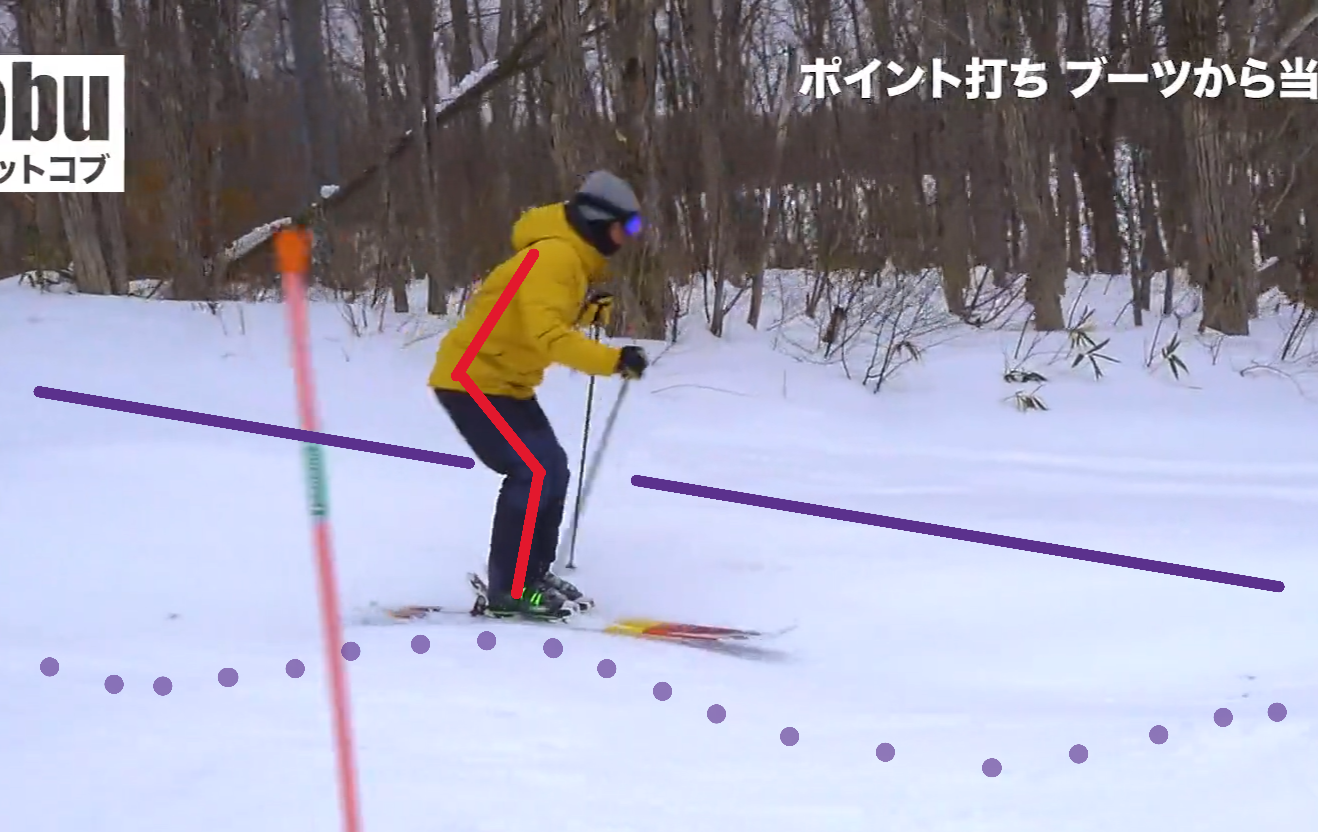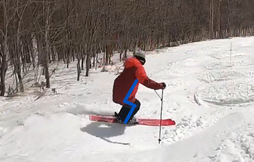・ガツンのブーツを彫り込んだ状態 ・ここではコブにぶつかる場面でもありますので身体は長い状態です ・コブでは落差やコブの圧力がかかりますので、低くなろうとしなくても低し姿勢になられます。 ・ひねりが出来ているところにも注目し下さい。ここがスキーに正対して身体の体側で衝撃をうけると横に発射します。 ・前からくるコブの衝撃に股関節から上の上半身が前に倒される。どうぞ倒して下さい!ごめんなさい!の形になっていれば問題ないです。