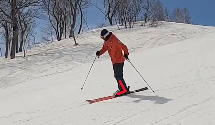 ・目線や身体の向きは斜滑降のまま進行方向に向いていますので、前傾+ひねりの外向傾姿勢になっています。
