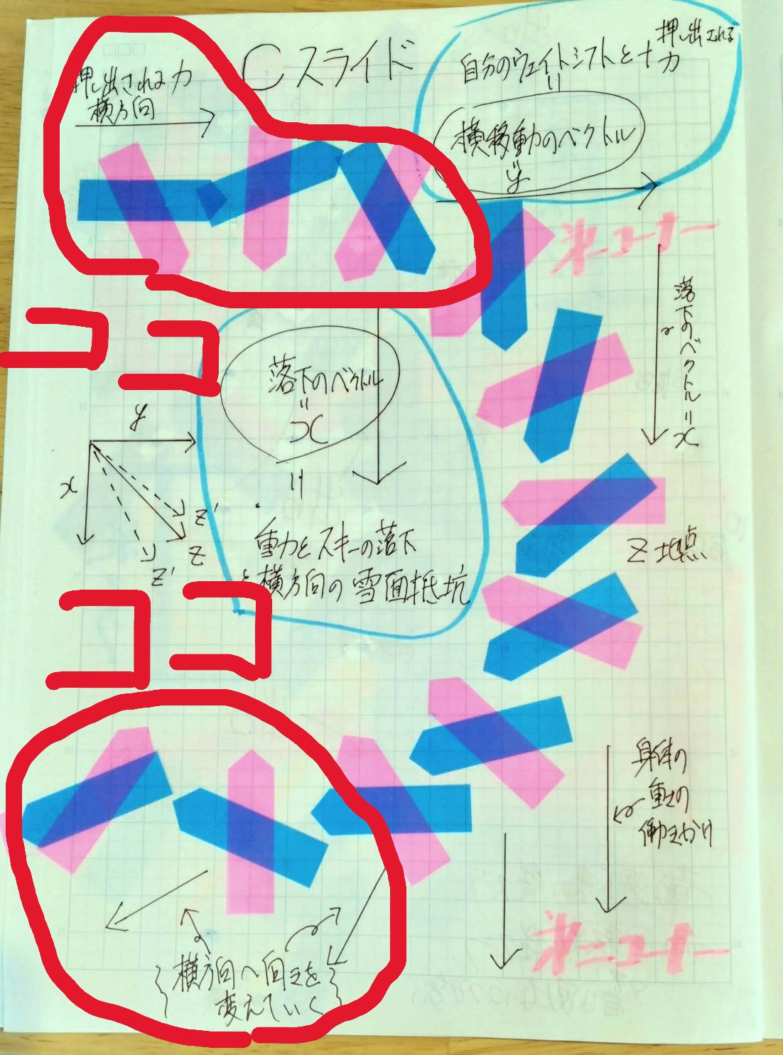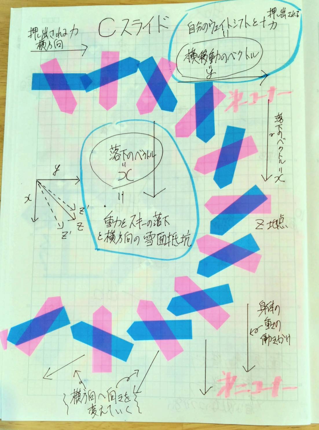 Cスライドに必要なのは、ターン前半の側方方向へのウエイトシフトと、ターン後半の下方向へのスライドということになると思います。下方向へのスライドはズルドンと同じですので、今回のズルドン脱却は、ズルドンに横移動をたしてあげるだけ。ということになります。