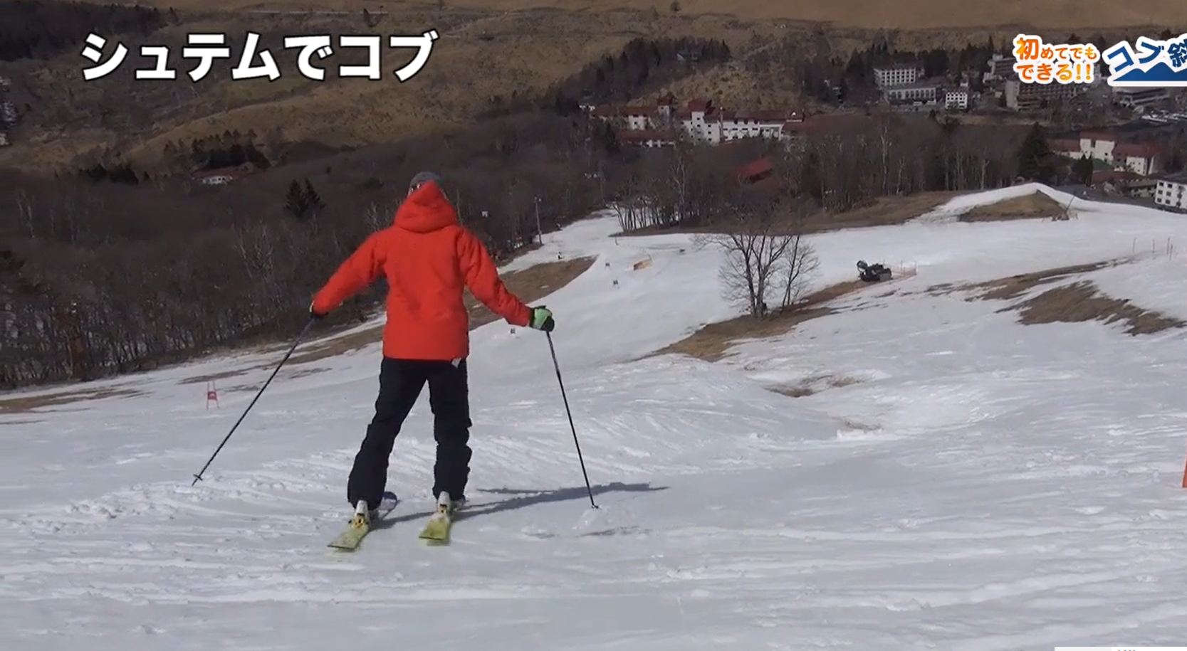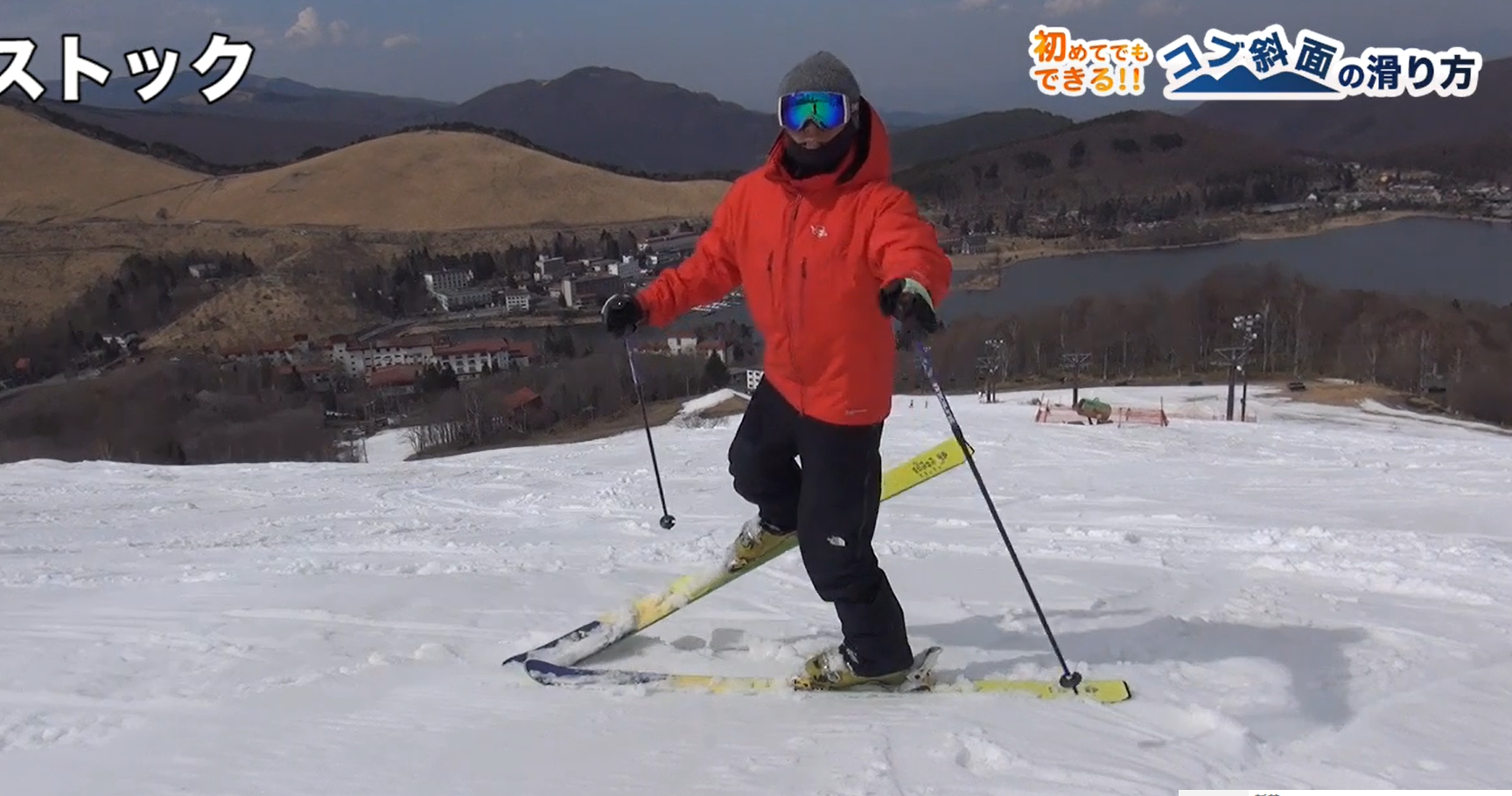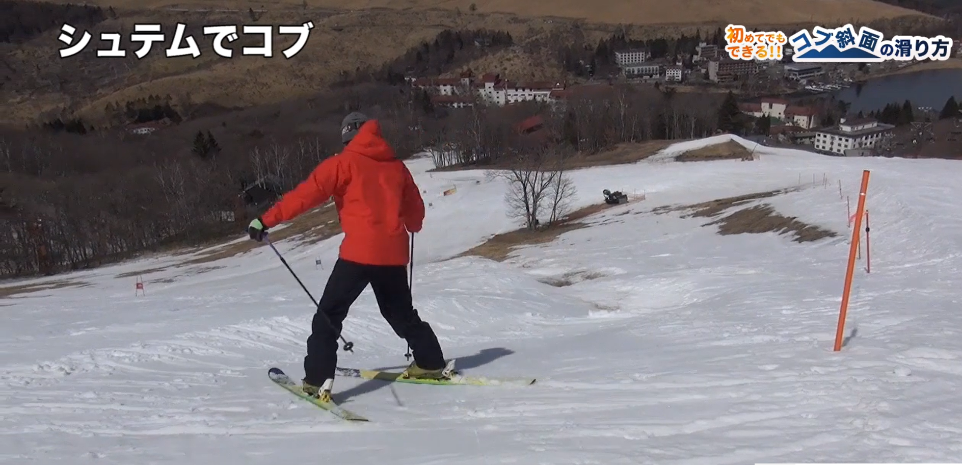 連続するとシュテムターンのようにも見えますが、開く目的がターン前半の丸み出すものではありませんので、開いたスキーに一本足で立つイメージが良い思います。また、開き方も、テールを大きく動かすのでは無くて、自分の身体の下でスキーの向きを変えるようします。