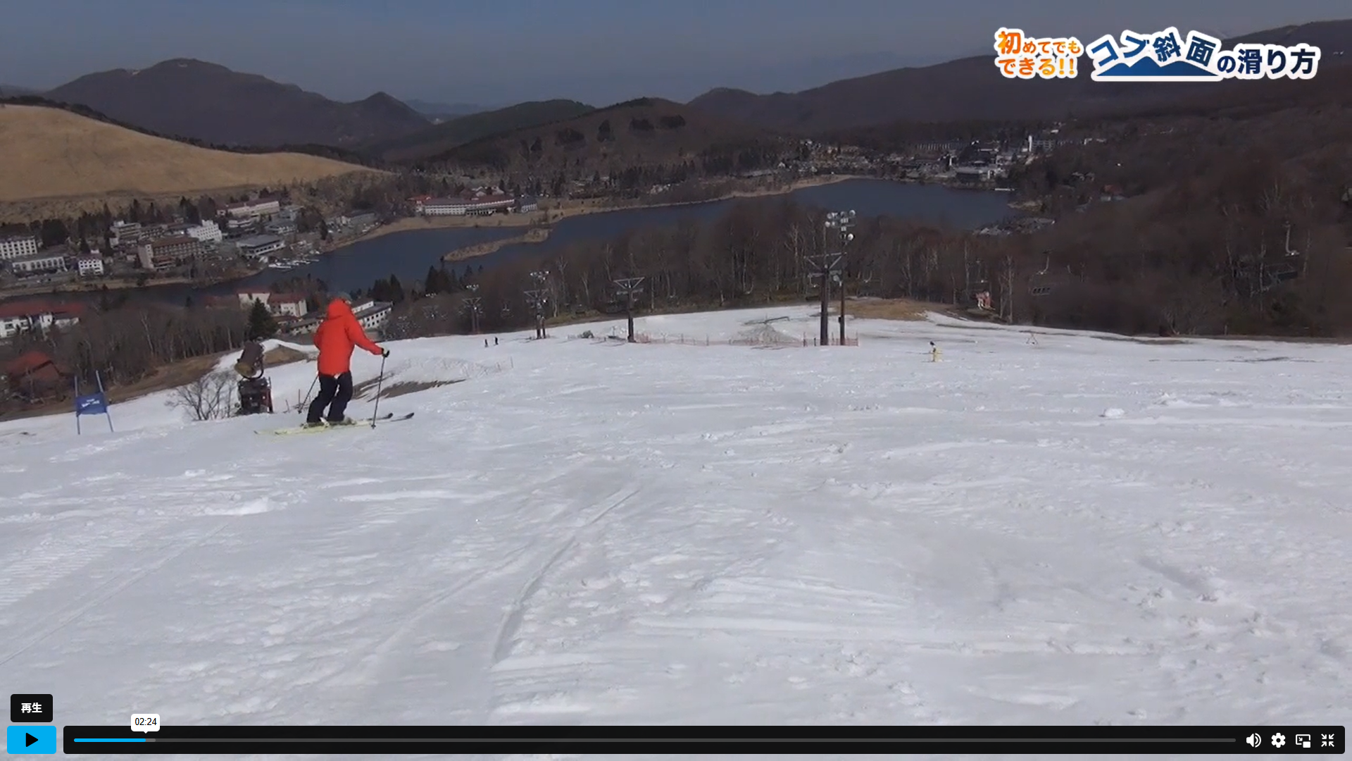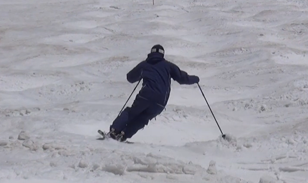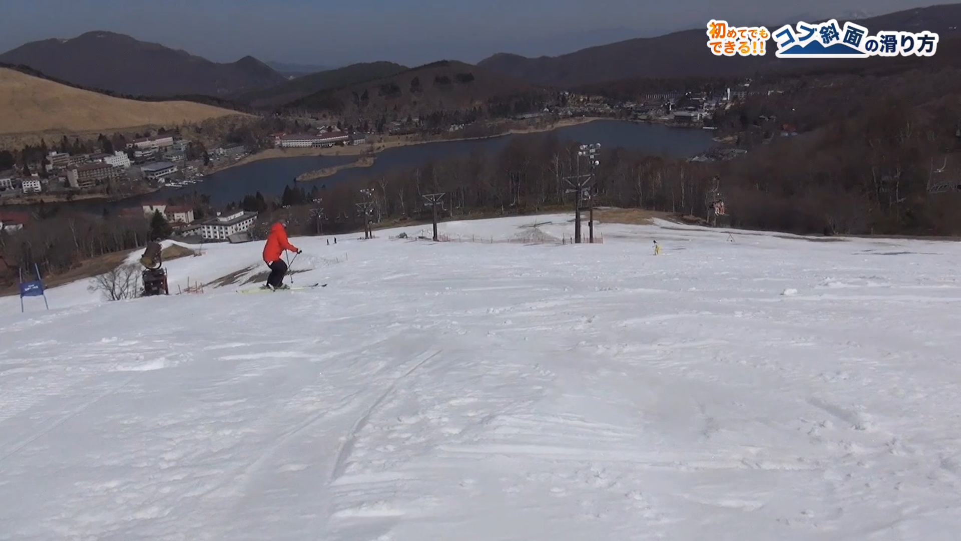 後半は、整地なら速度が落ちますが、コブではスキーが向いていく方向に沿って溝や、バンクのフォールラインがありますので、その力の向きの横方向に、力を働かせることが必要となります。