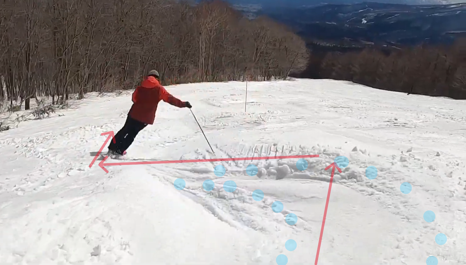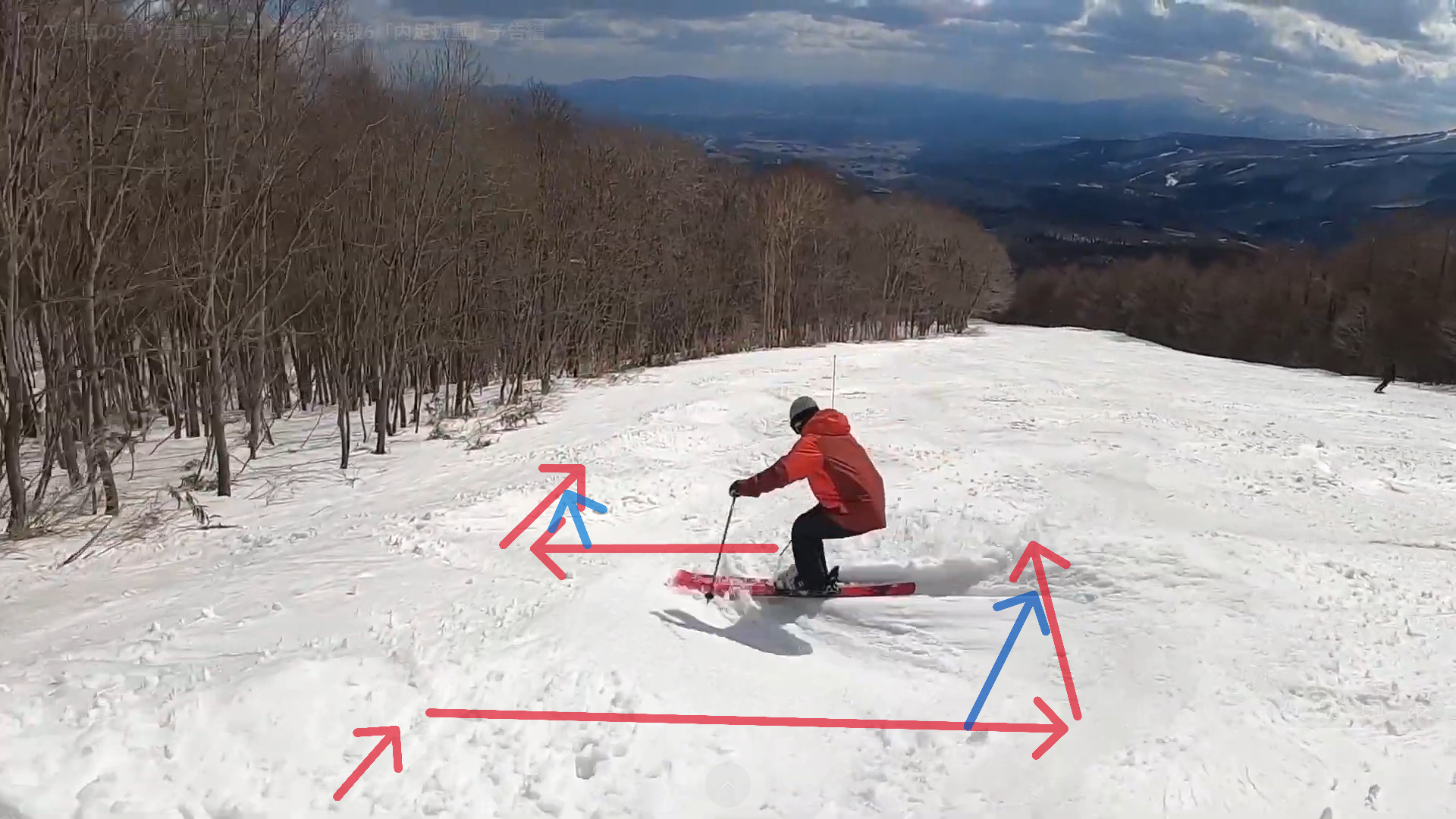 前半の横ベクトルは、ウエイトシフトと、方向を変える前のスキーの進行方向の力を借ります。コブに押し出される力も使えれば良いです。