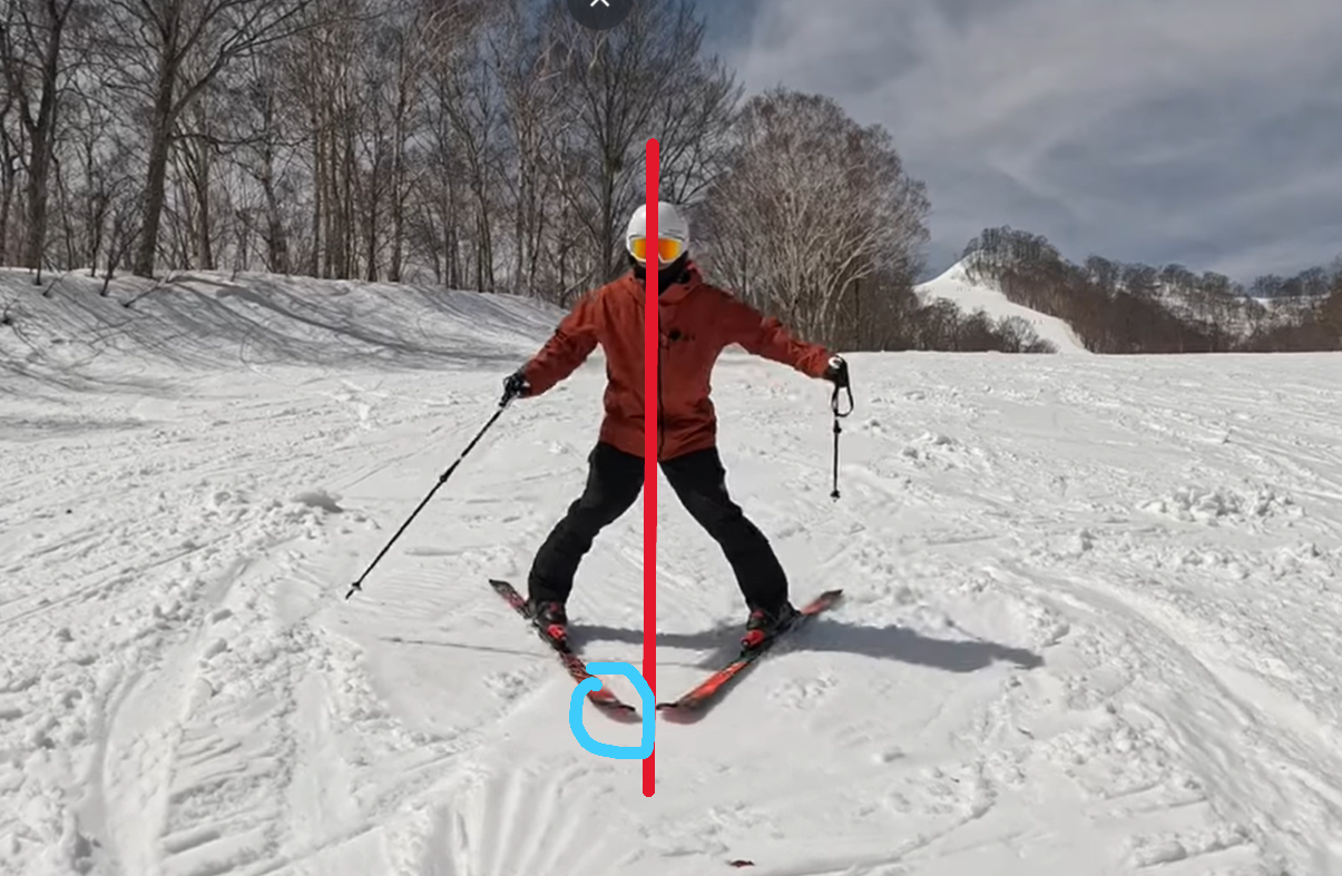 開いたスキーに傾いて横移動が止まっています。またスキーに傾いた結果、スキーに荷重されていますので、もうスキーが横スライドしない状態です。コブでは溝にまっしぐらになります。開いたスキーまでは移動は出来ていますので、ウエイト乗せて終わりじゃなく、ウエイトがまだ側方へ進み続ける必要があります。抜重を使ってラテラルムーブメントのウエイトシフトすれば良いと思います。