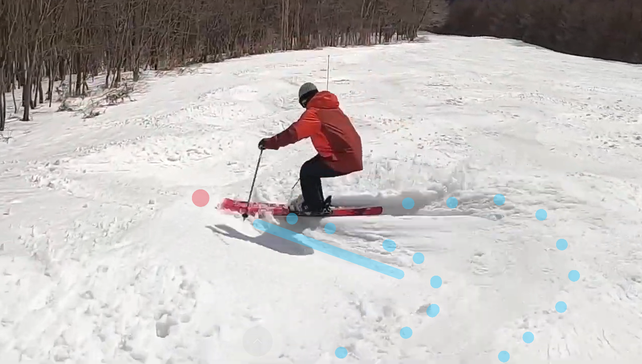 逆ハンドルが入りました。スキートップが斜面上、テールが斜面下、進行方向に対してスキーの角度が深まりましたので、スキーは一瞬止まろうとしますが、身体の重さが、そのままの進行方向(林の太い木あたり)に動いた結果、足元を身体が超えました。ここが斜面下に自分が入った感覚。ターンの内側に一瞬だけ入ったシーンです。