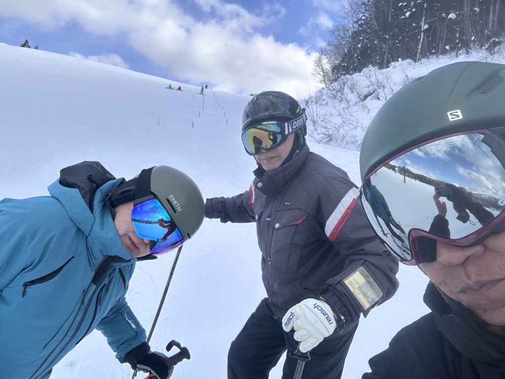 基本姿勢で直滑降からスキーを横に向けてからスライドをキープしながら停止を練習しました。