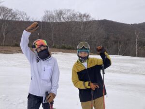 横スライドとは、板を斜面の対して真横に向けた状態でずらす技術となりますが、まずはスキーがずれる運動要領の案内を行いました。
