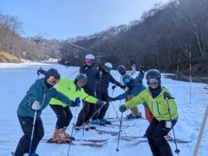 縦スライドを身に付けて行くにあたって、斜滑降、進行方向へ進み続けるシュテム。シュテムをパラレルに変える。と言う方法と、ホッキーストップ45度のスライドから作る方法が有りますが、ゲレンデを広く使えない状況でしたから、ホッキーストップ45度から縦スライドを作って行きました。斜滑降からシュテムを使っての方法も、シュテム迄を縦目に滑りながら説明させて頂きました。