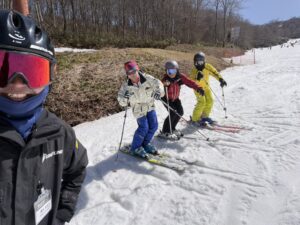 本日は、春特有の「グサ雪(水分を含んだ重いザラメ雪)」と、緩斜面に深く掘れた「縦溝コブ」という、テクニカルかつタフなコンディションの中、ウォールスライドをテーマにトレーニングを行いました。